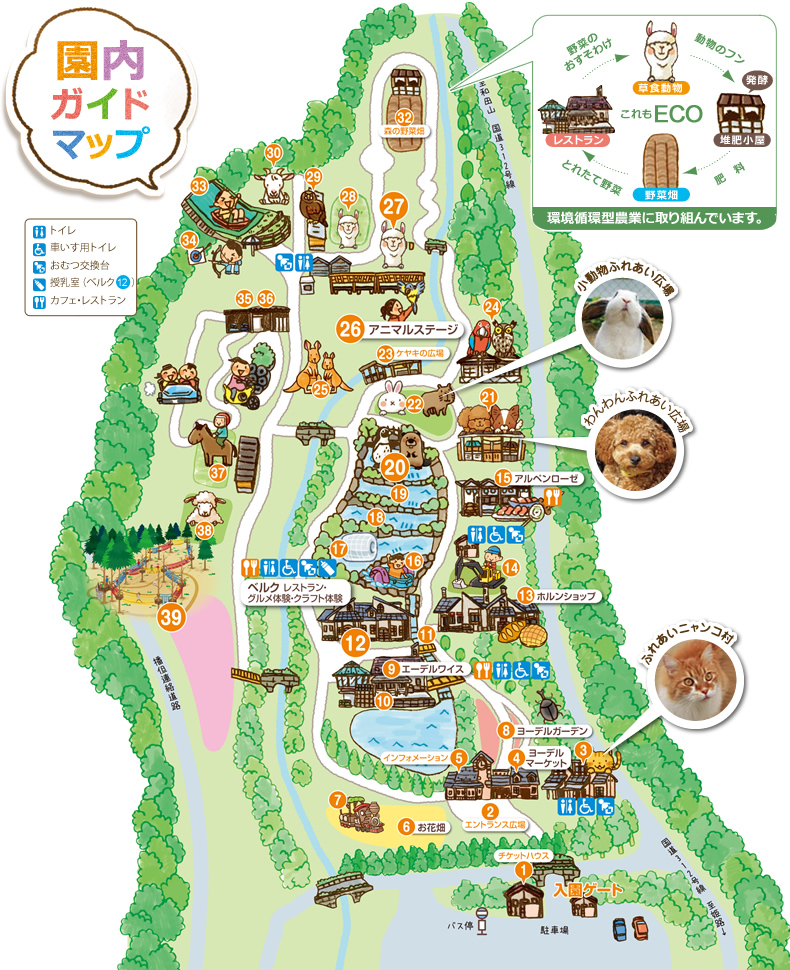 テレビCMでおなじみのアンデスの妖精『アルパカ』牧場をはじめ、かわいい羊やヤギ、馬とのふれあい牧場、犬や小動物と遊べるふれあい広場も登場。