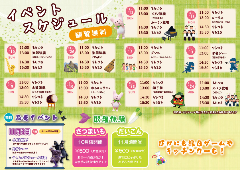 ※イベント内容は ( 悪天候・出演者の都合により ) 予告なしに変更する場合がございます。ご了承下さい。