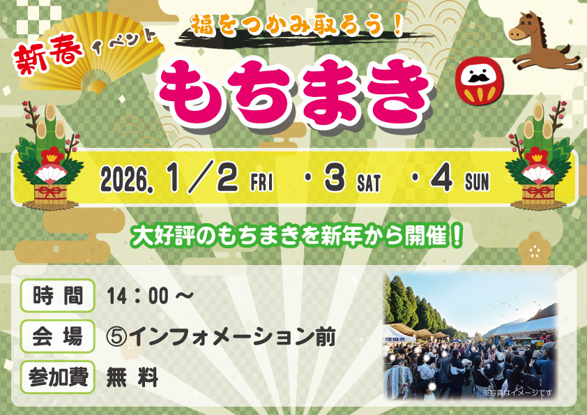 令和8年 1月2日(金)~4日(日) 3日間 ヨーデルの森大好評の『餅まき』を開催致します。 【開催時間】14時~ ※雨天中止 【場所】パンフレットNo②エントランス広場 お餅をたくさんGETしてお持ち帰り下さい。